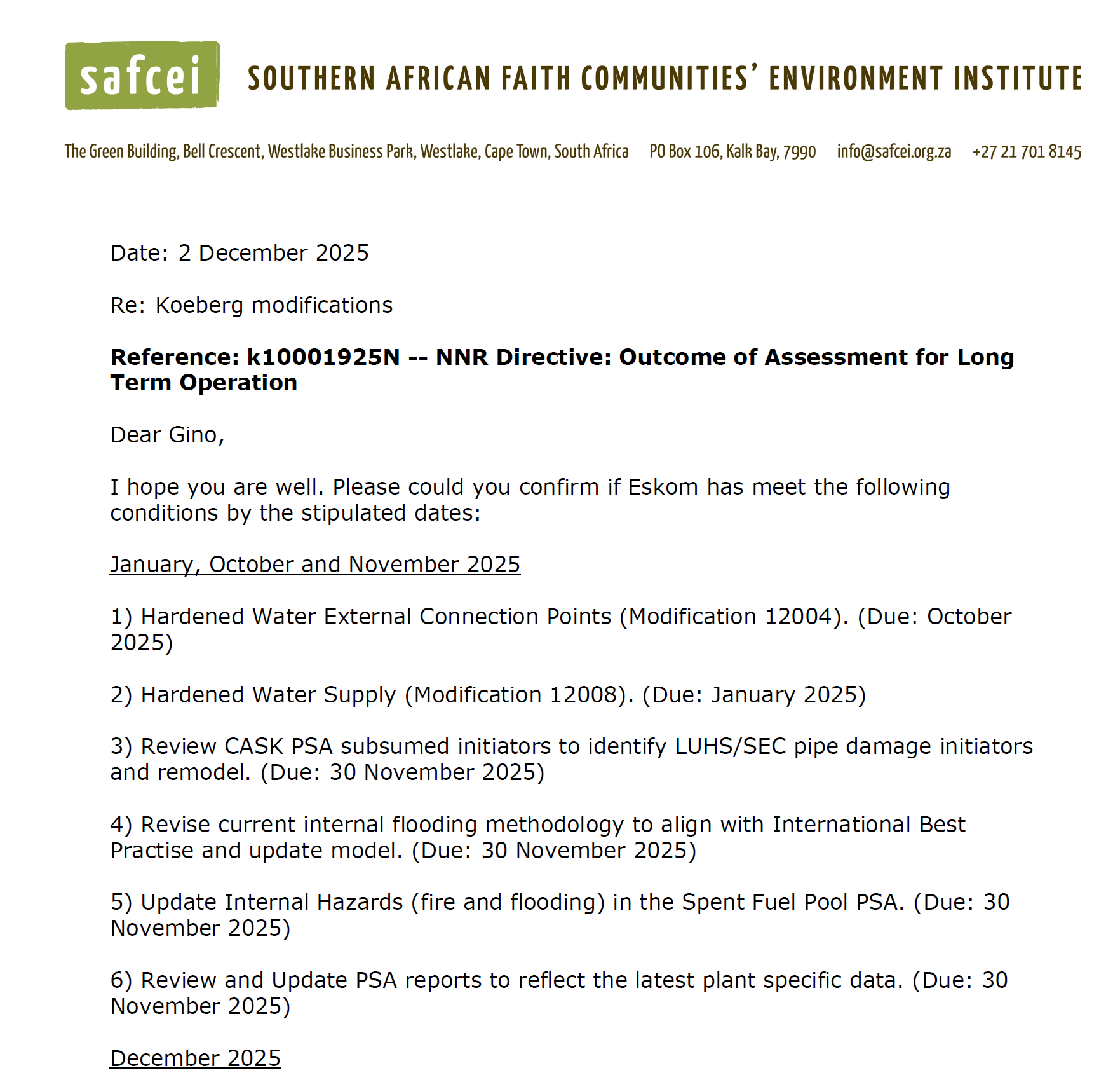 Click here to read SAFCEI's letter to the NNR Directive: Outcome of Assessment for Long Term Operation...