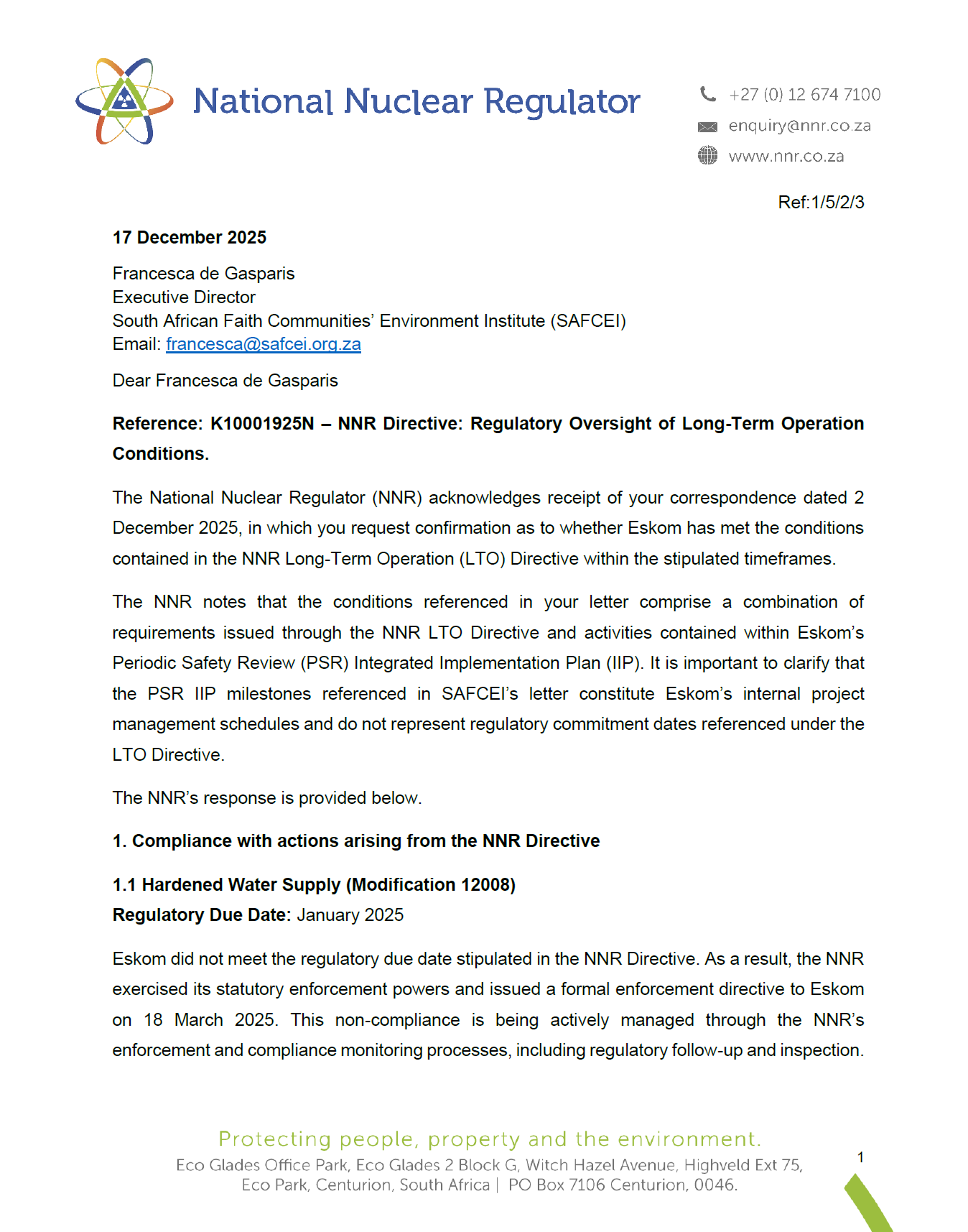 Click here to read the NNR's response to SAFCEI's letter to the NNR Directive: Outcome of Assessment for Long Term Operation...