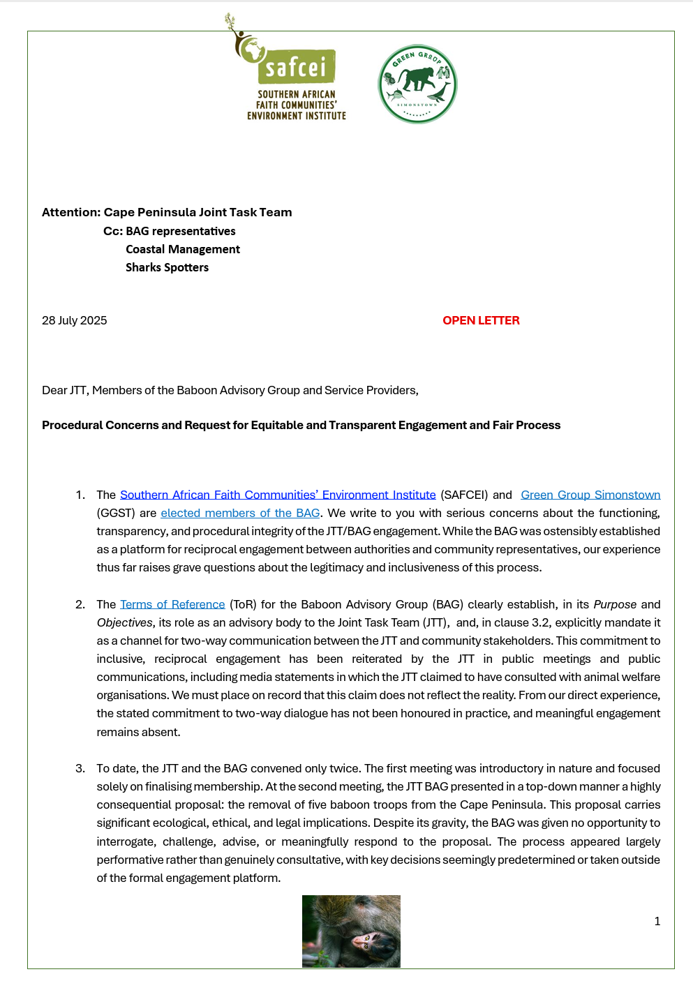 Click here to read the SAFCEI's joint letter to JTT and Members of BAG...